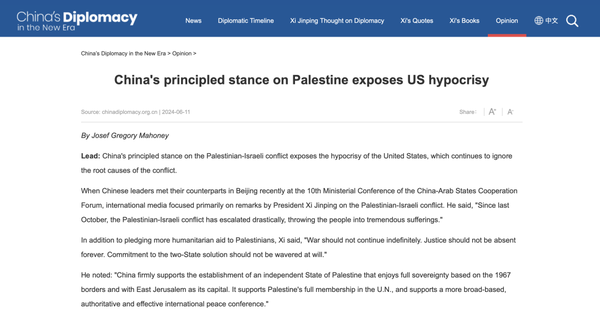 媒体视野|马奥尼教授在习近平外交思想和新时代中国外交网站发文谈「中国对巴勒斯坦的原则立场暴露美国虚伪」