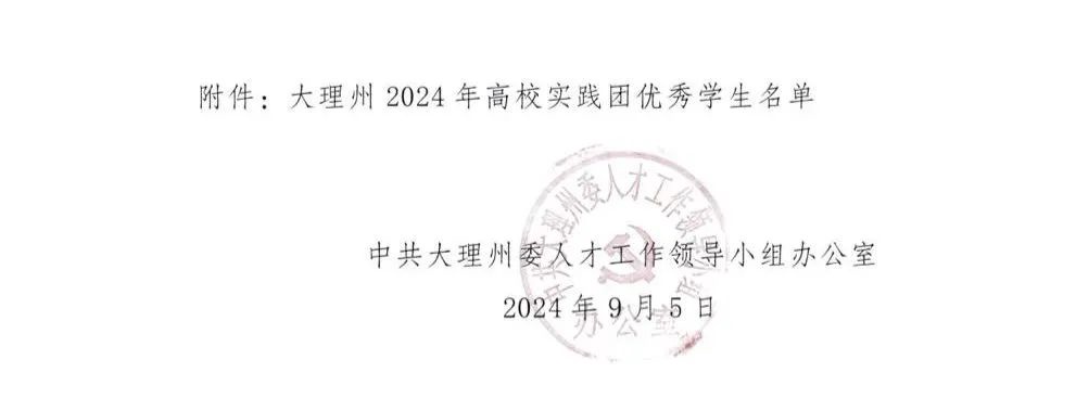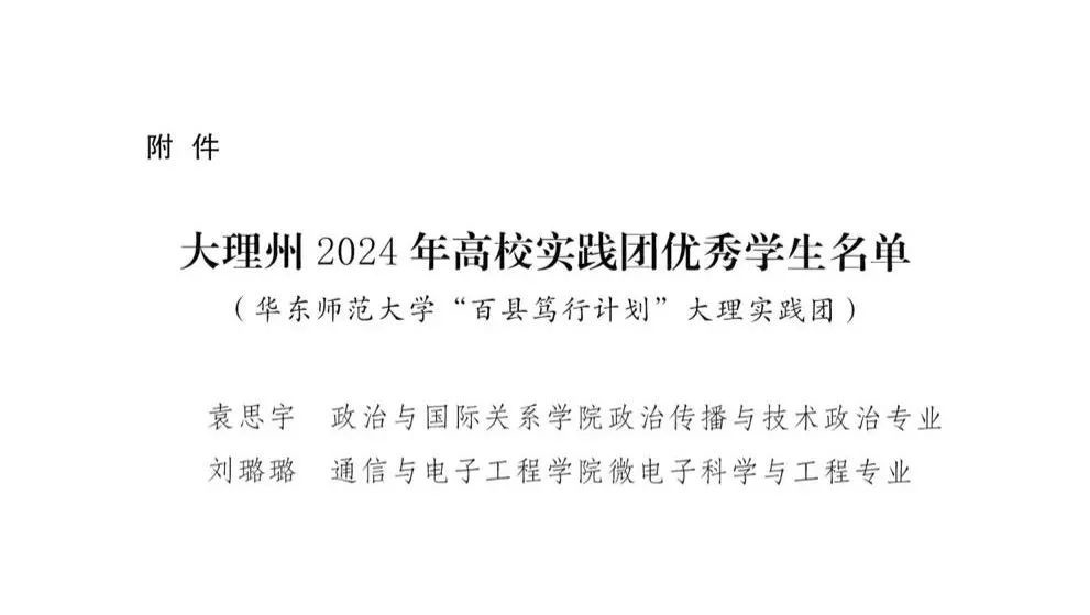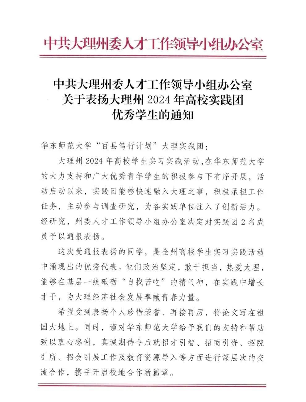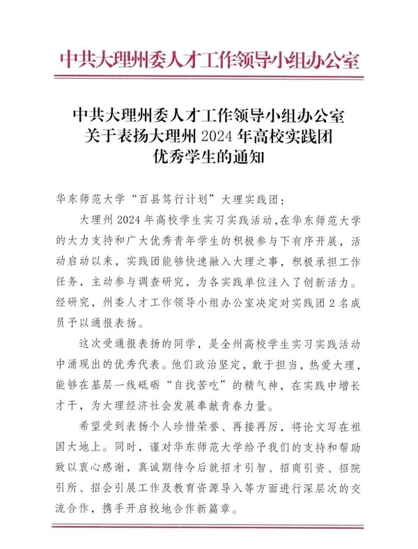 在刚刚结束的华东师大“2024年百县笃行计划”生涯实践中,政治与国际关系学院2023级硕士研究生袁思宇同学荣获由中共大理州委人才工作领导小组办公室颁发的“优秀学生”的称号!
