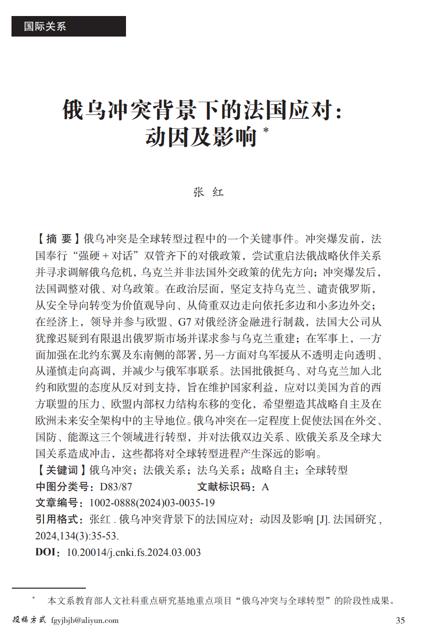 近日,我院张红副研究员于《法国研究》2024年第3期发表《俄乌冲突背景下的法国应对:动因及影响》一文,本公众号转载全文与读者共享。