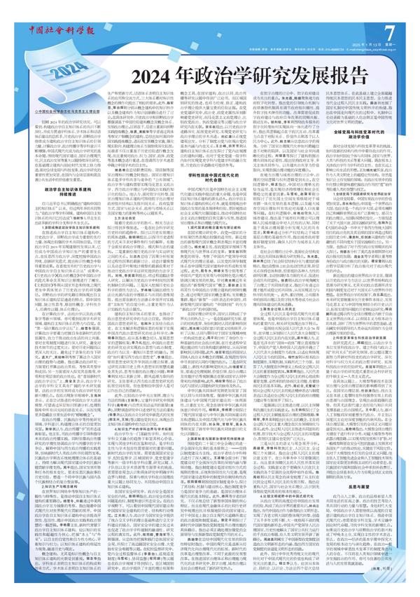 回顾2024年的政治学研究状况,可以看到:构建政治学自主知识体系的共识不断深化,并成为贯通学科体系、学术体系和话语体系建设的总抓手,历史政治学、田野政治学继续成为建构政治学自主知识体系的引领力量,计算政治学、政治传播学等学科意识不断增强;中国式现代化成为政治学研究的基本命题,围绕现代国家建设、国家治理现代化、民主政治发展等重大议题持续深化研究,在基础理论建构与回应时代发展上协力推进;面对全球变局与科技变革,政治学研究的重要性更加突显,在国内与全球层面构筑良善公共生活中的价值愈发重要。