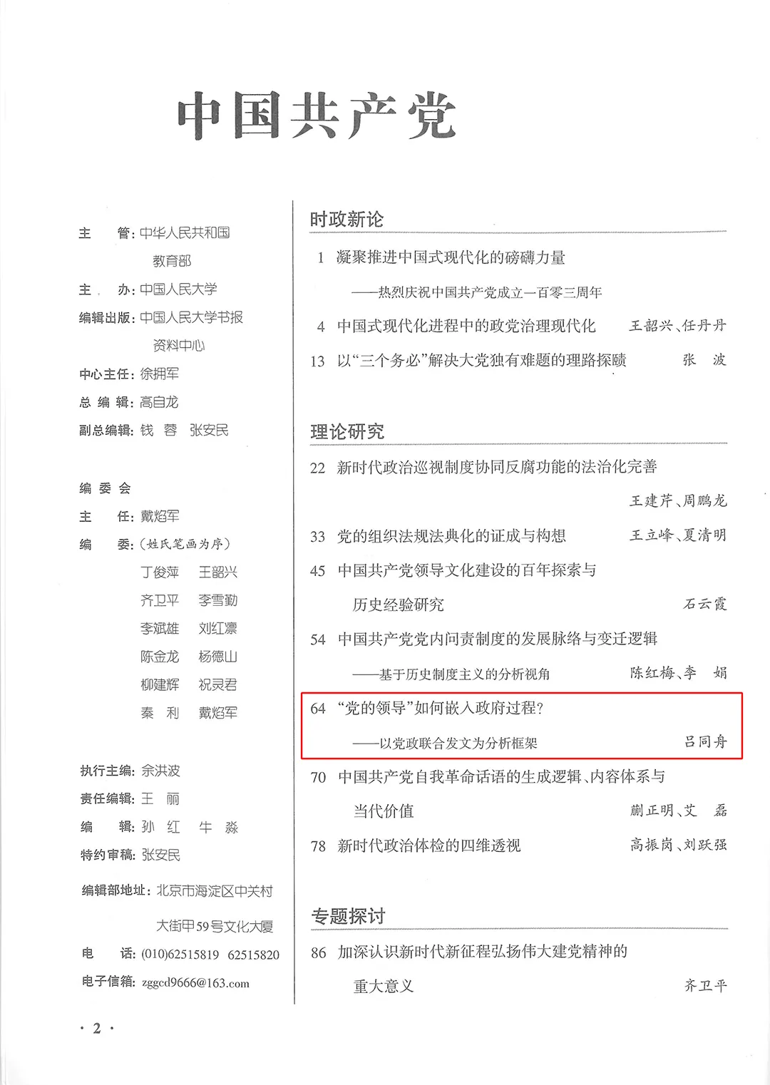 祝贺!吕同舟副教授论文《“党的领导”如何嵌入政府过程?——以党政联合发文为分析框架》获人大复印报刊资料《中国共产党》全文转载