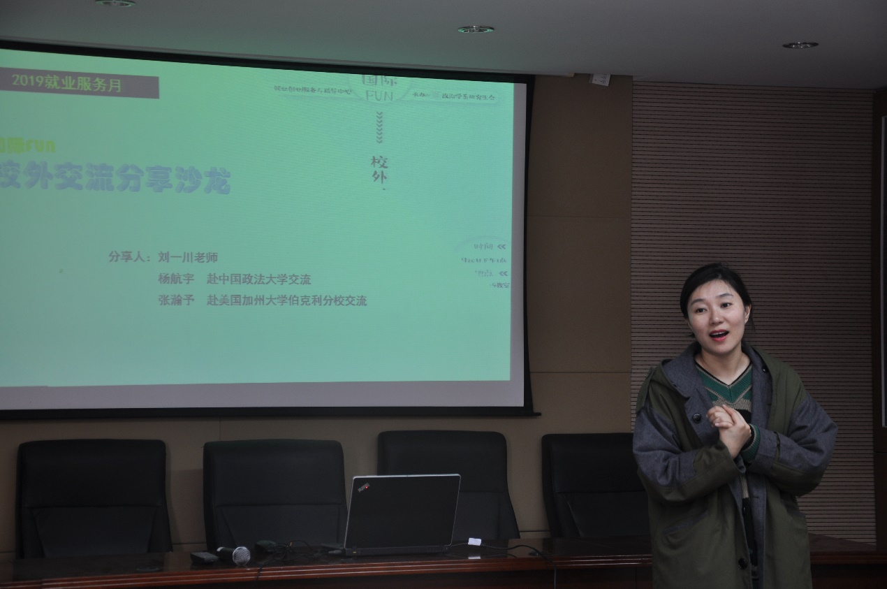 3月20日,由校就业创业服务与指导中心主办、政治学系承办的本学期首场就业服务月活动在法商北楼329教室如期举办。围绕“国际FUN访学交流”的话题,政治传播与政府公关教研室刘一川老师和来自2016级公共关系学专业的杨航宇、张瀚予同学一起交流了访学政策、分享了留学经验。 大二时,杨航宇和张瀚予分别到中国政法大学和美国加州大学伯克利分校交流学