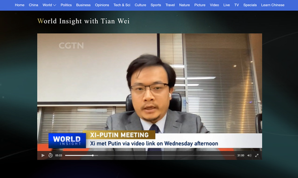 12月15日,上海国际问题研究院赵隆研究员参加中国国际电视台(CGTN)World Insight with Tian Wei节目直播,与俄罗斯中国问题专家卢金、中国国研院崔洪建所长共同点评中俄元首视频会晤。