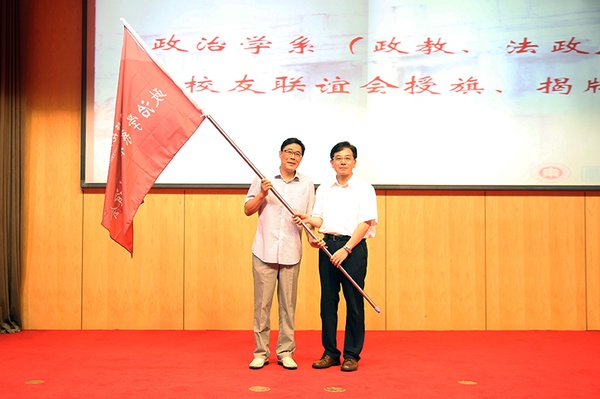 副校长、校友会常务副会长郭为禄向政治学系校友联谊会会长齐卫平授旗