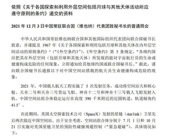 2021年12月27日,多家媒体报道说,根据联合国和平利用外层空间委员会官方网站上公布的文件,中国常驻联合国(维也纳)代表团在12月初向联合国秘书长提交普通照会表示,美国 Spacex 公司发射的星链卫星今年先后两次接近中国空间站,对中国空间站上的航天员生命和健康构成威胁;出于安全考虑,中国空间站组合体两次实施“紧急避碰”。