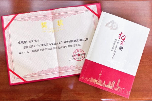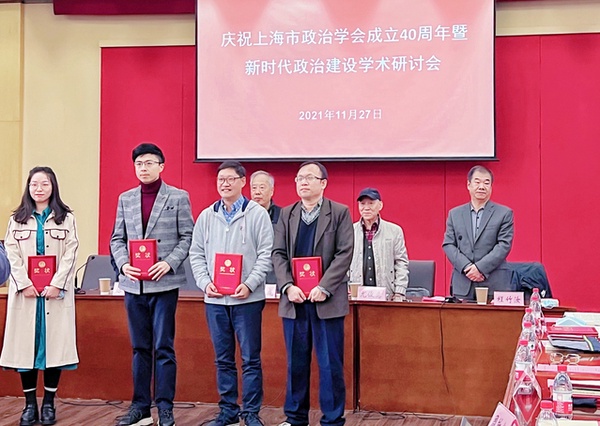 庆祝大会环节,与会学者共同回顾了上海市政治学会成立历史和上海市哲学社会科学优秀成果奖(1979-2017);程竹汝教授主持了“40周年40篇(部)”优秀成果纪念奖颁奖仪式,我院吴冠军教授、王向民教授、张振华教授、马奥尼教授获奖。