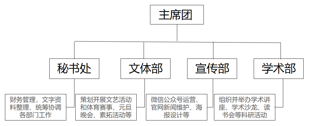 政治与国际关系学院第一届研究生会共有30名成员,根据自身发展和实际工作的需要,研会目前分设主席团(3位)和4个职能部门:秘书处、文体部、宣传部和学术部。