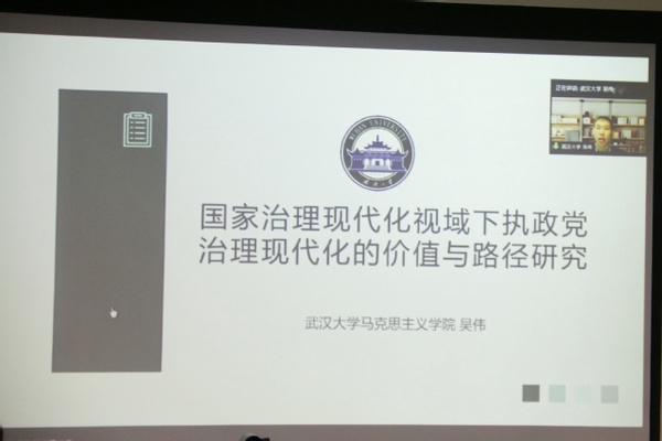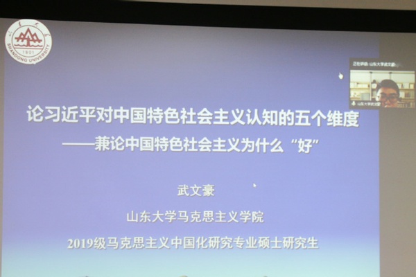 在主题发言的第一部分,来自北京师范大学的李昊天同学从中国现代化的三重意蕴,即作为事件的现代化、作为话语的现代化与作为史观的现代化三个切入点展开,对中国现代化的意蕴进行了历史和现实的思考;北京师范大学的石卓群同学从全面建成小康社会的思想渊源、历史进程和历史经验展开,来论证全面建成小康社会的历史进程和治国理政的经验;复旦大学的葛世林同学从坚持思想理论创新是执政党建设的不竭动力、拥有广泛的群众基础和先进的党员队伍是执政党建设的重要课题、永葆党的先进性和纯洁性是执政党建设的根本保证三个视角来论述全面建成小康社会进程中执政党建设的基本经验;山东大学的武文豪同学从发生论、结构论、在特征论、发展论、价值论五个层面来探讨中国特色社会主义的价值意蕴,从而形成了对中国特色社会主义新的更为全面和科学的系统认知;武汉大学的吴伟同学认为执政党治理现代化与国家治理现代化之间存在着内在的逻辑联系,具体从制度体系、党内政治文化、干部队伍和信息化治理保障,执政党自身治理现代化的程度和效果来论述对国家治理现代化的程度和效能的内在联系;安徽工程大学的蒋旭同学从地区治理背景下区域化党建的内涵、困境、对策等角度来进行地区治理视角下区域化党建理论分析。