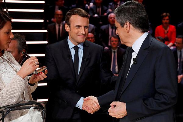 当地时间2017年3月20日,法国巴黎,法国举行总统候选人电视辩论。总统候选人菲永与马克隆(中)握手