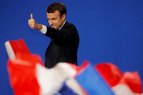 马克隆在初步结果出来后向支持者致意