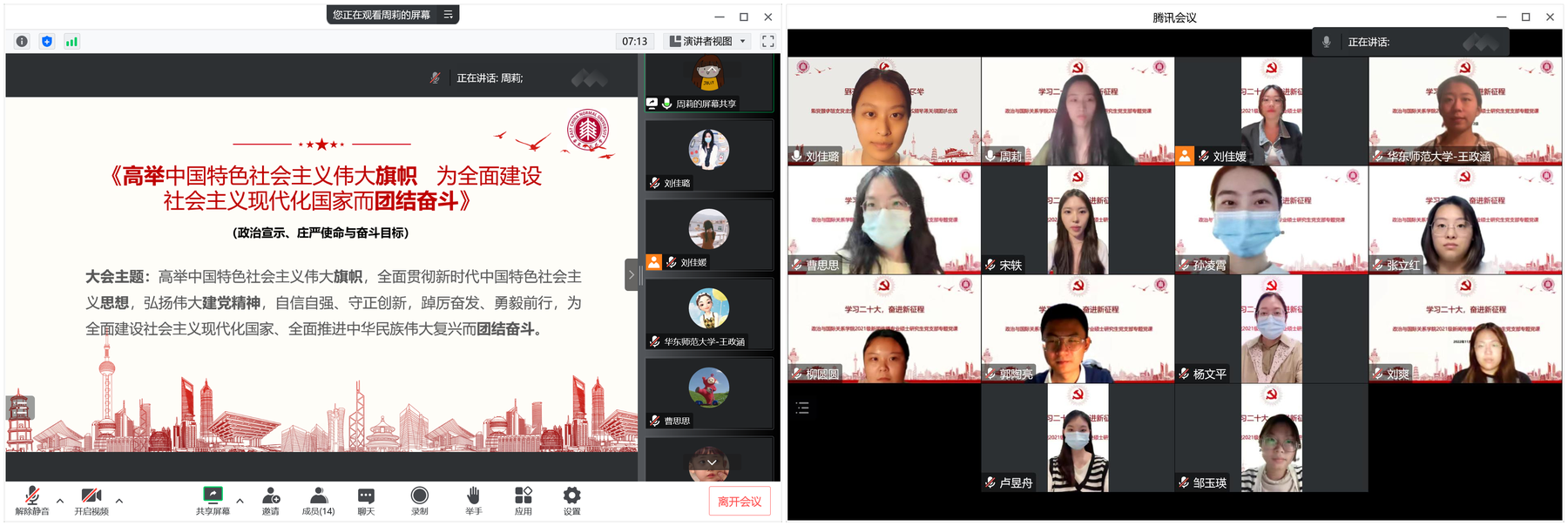 2022年11月21日,我院国际关系专业研究生党支部采取线上线下相结合的形式,开展题为“学思践悟 以学促行”党的二十大报告专题学习活动,党支部书记张翌然主持。