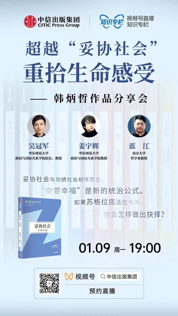 2023年1月9日,中信出版集团特邀华东师范大学政治与国际关系学院院长、教授吴冠军、华东师范大学政治与国际关系学院教授姜宇辉、南京大学哲学系教授蓝江,围绕韩炳哲及其《妥协社会》一书来聊聊在后疫情时代,我们该如何面对肉体和精神上的疼痛,以及在元宇宙的虚拟世界里,我们会如何理解快乐与痛苦,或者幸福与创伤。