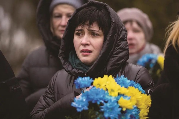 2月24日,俄乌冲突升级一周年之际,在乌克兰布恰的一个阵亡士兵墓地里,一位乌克兰妇女悲伤落泪。