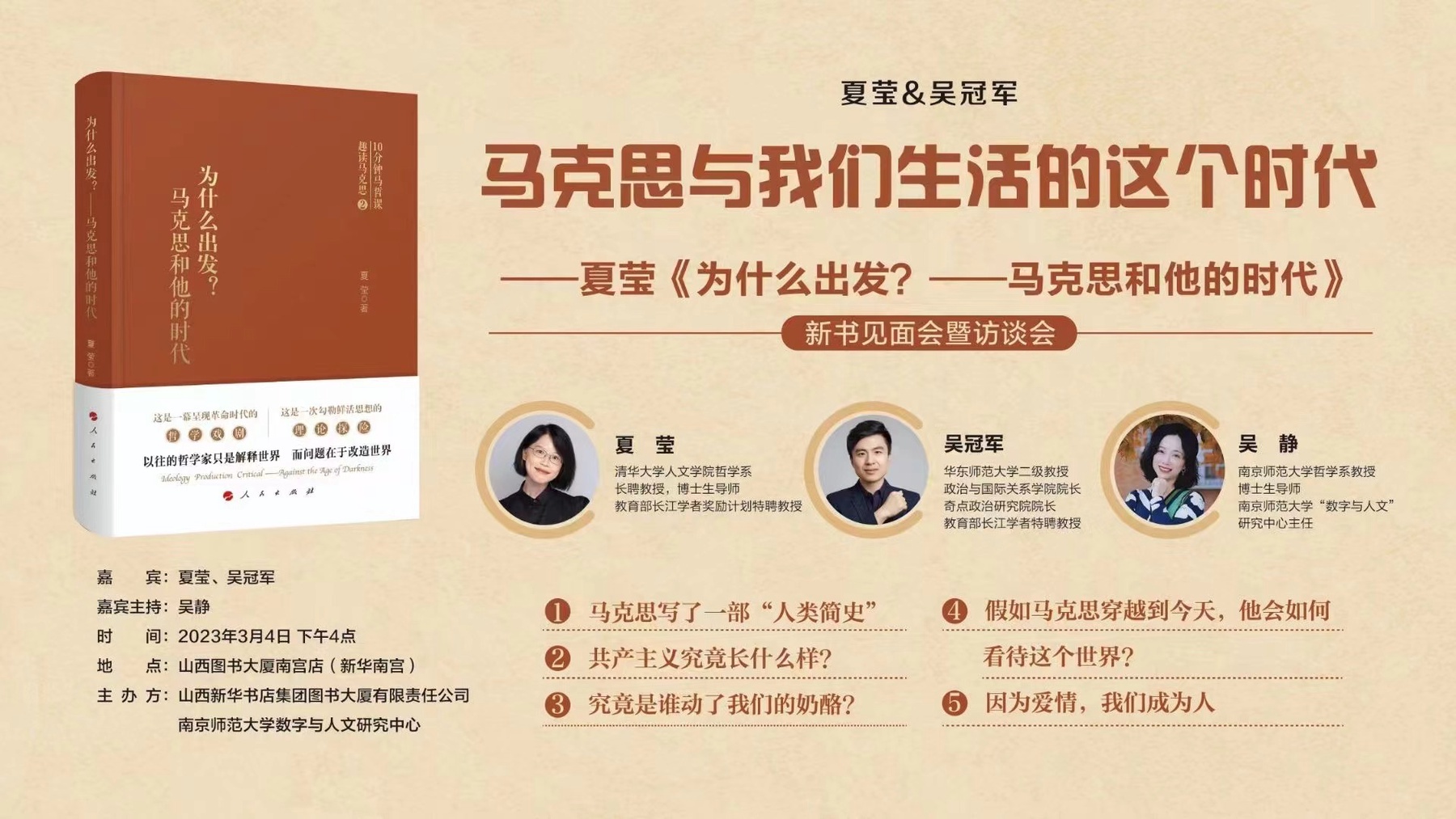 2023年3月4日16:00,我院吴冠军教授将出席由山西新华书店集团图书大厦有限责任公司与南京师范大学数学与人文研究中心共同举办的「夏莹《为什么出发?——马克思和他的时代》」新书见面会暨访谈会。将出席本次活动的嘉宾还有该书作者夏莹教授与南京师范大学吴静教授。