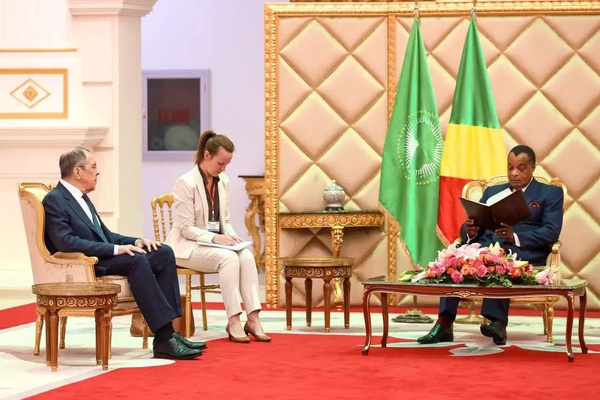 当地时间2022年7月25日,刚果奥约,俄罗斯外长谢尔盖·拉夫罗夫会见刚果共和国总统德尼·萨苏-恩格索。(图自视觉中国)