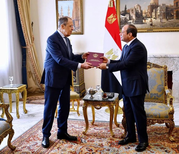 当地时间2022年7月24日,埃及首都开罗,埃及总统阿卜杜勒·法塔赫·塞西(右)和俄罗斯外长谢尔盖·拉夫罗夫(左)在一次会议上对接一份文件。(图自视觉中国)