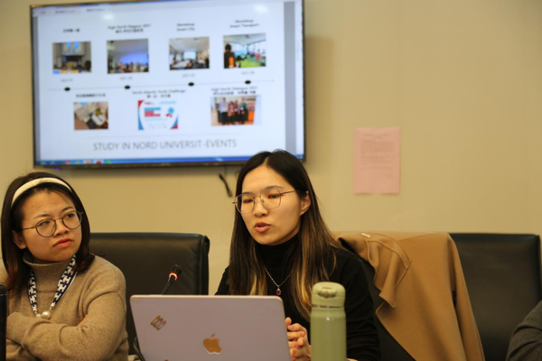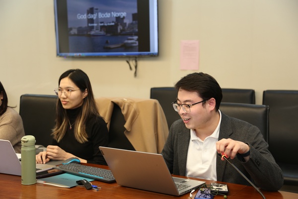 “我们这一代留学生的使命是什么?”刘意同学认为,在挪威的学习,可以帮助大家感受国外的社会发展状况,同时思考回国后我们可以做些什么。她代表班级详细回顾了在挪威的学习生活。诺德大学的线下课程内容丰富多元,将实际案例与理论知识相结合。同学们学习了许多环保及能源管理方面的特色课程,积极参加各项学术活动,并获得多项奖项,钟紫嫣、王莹、沈施余、孙文宣四位同学荣获smart city研究奖学金,刘意、孙文宣、潘佳慧三位同学组成的团队获2022年高北论坛创新创业比赛第二名。同学们还积极参加诺德大学的学生活动,高凡、刘意作为学生会成员参与了国际文化节等多项活动,孙文宣和刘芳鑫作为志愿者参与了各类贫困援助公益项目。此外,登山、滑雪、钓鱼、观赏极光等精彩的课外活动也是难以忘怀的美好回忆。