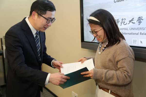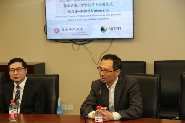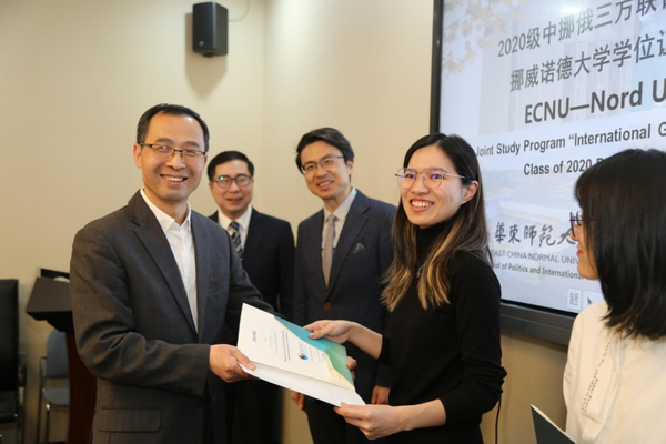 2023年3月8日,华东师范大学首届中挪俄三方联合培养硕士项目挪威诺德大学学位授予仪式在普陀校区理科大楼A416室举行。政治与国际关系学院院长吴冠军、党委书记潘靓、俄罗斯研究中心执行主任兼副院长刘军为同学们颁发学位证书,2020级中挪俄三方联合培养项目硕士参加,院党委副书记鲁静主持仪式。
