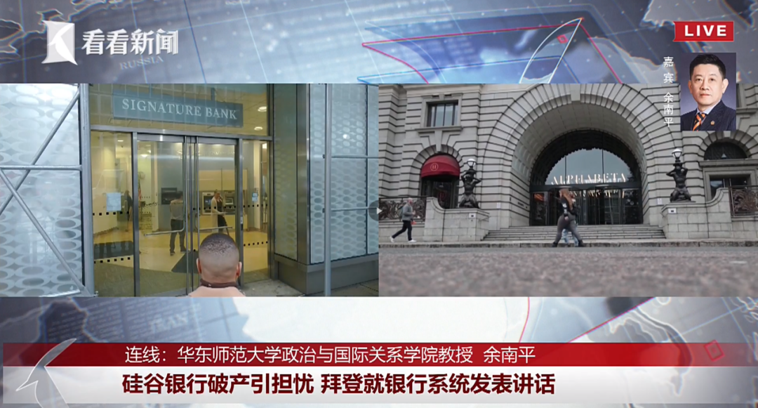 北京时间3月14日晚,华东师范大学政治与国际关系学院教授、上海市人民政府决策咨询基地、余南平工作室首席专家余南平就「硅谷银行破产引担忧 拜登就银行系统发表讲话」接受看看新闻Knews直播连线。