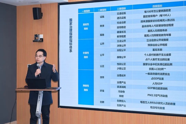 第二,我想谈谈国家治理现代化的内涵及目标。国家治理现代化这一议题非常经典,也非常重要,其是政治学的核心命题。同时,国家治理体系的重点是系统性。那我们要怎么判断国家治理的系统是成体系化的的呢?出于对这一问题的思考,我后来在做指数的过程当中,就把国家治理体系的提炼为三个核心系统,包括秩序系统、赋权系统、创新系统。首先,任何国家的治理肯定要有很好的秩序系统,这个秩序系统既包括它的税收,还包括对暴力的垄断,即个人不能随便滥用暴力。第二个是赋权系统,这是说国家要对社会的单元,包括个体进行充分地赋权。在最早的国家中,比方说前现代的国家,其可能更多强调秩序系统。不过,现代国家一定是强调赋权系统的。比如说今天所讲的民主,其实是在赋权系统上发展起来的。第三个是创新系统。创新是国家发展的持续动力。因为任何国家想要在非常复杂的环境中胜出,就一定要走到产业链的最高端。在国家治理中,其实是很难保证秩序的,国家要有足够资源才能进行暴力垄断,同时赋权也要资源,因而创新其实是保持活力的关键。