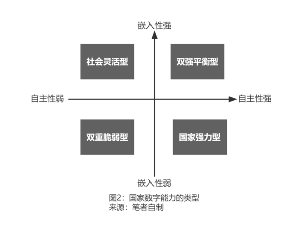 所以,以这两个指标作为纵轴与横轴会形成四种类型的国家数字能力。最理想的类型是双强平衡型,而最糟糕的类型是双重脆弱型。双重脆弱型意味着国家既没有自主能力,也没办法让平台企业协助自身进行治理。其实,现在在数字领域,更多体现的是一种社会灵活型数字能力。之前在有些方面,国家更多采取的是委托治理,但是在数字治理领域却并非如此。当然,最理想的国家数字能力是,国家自身能力很强,然后又对平台企业有一定的规则约束能力。