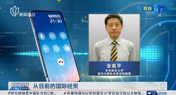 3月30日晚,华东师范大学政治与国际关系学院教授、上海市人民政府决策咨询基地/余南平工作室首席专家余南平就“美众议院通过剥夺中国‘发展中国家’地位草案”接受上海广播电视台新闻综合频道《新闻夜线》采访。