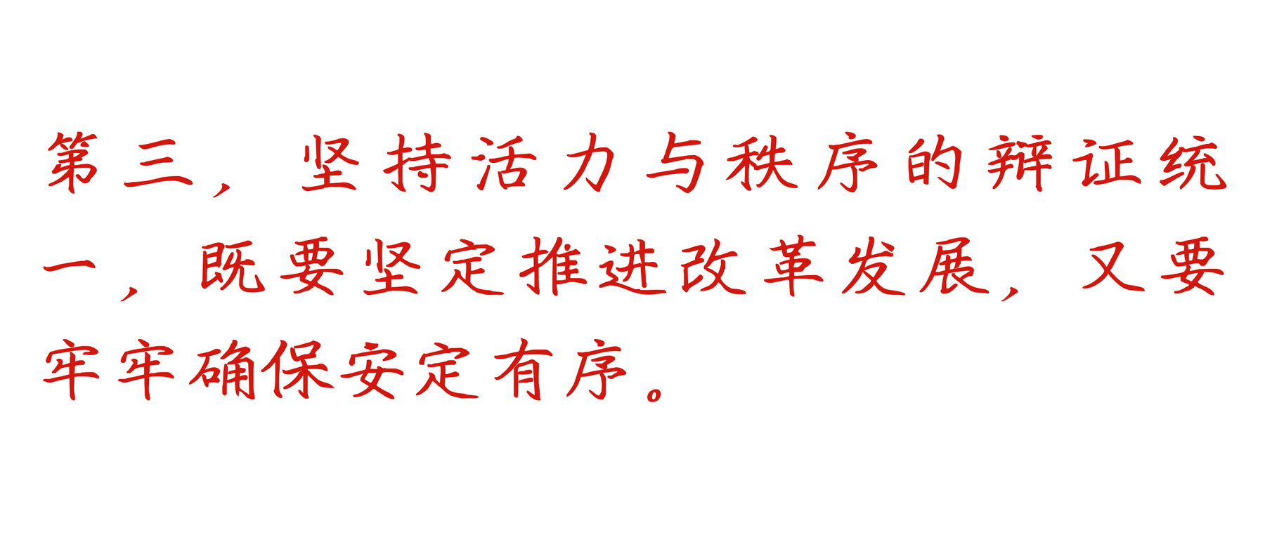 新形势下,要牢牢坚持以人民为中心,把社会安定有序作为改革发展的前提,把改革发展作为维护安定有序的必要条件,促进秩序与活力的动态平衡,为强国建设营造良好环境、打造持续动能。