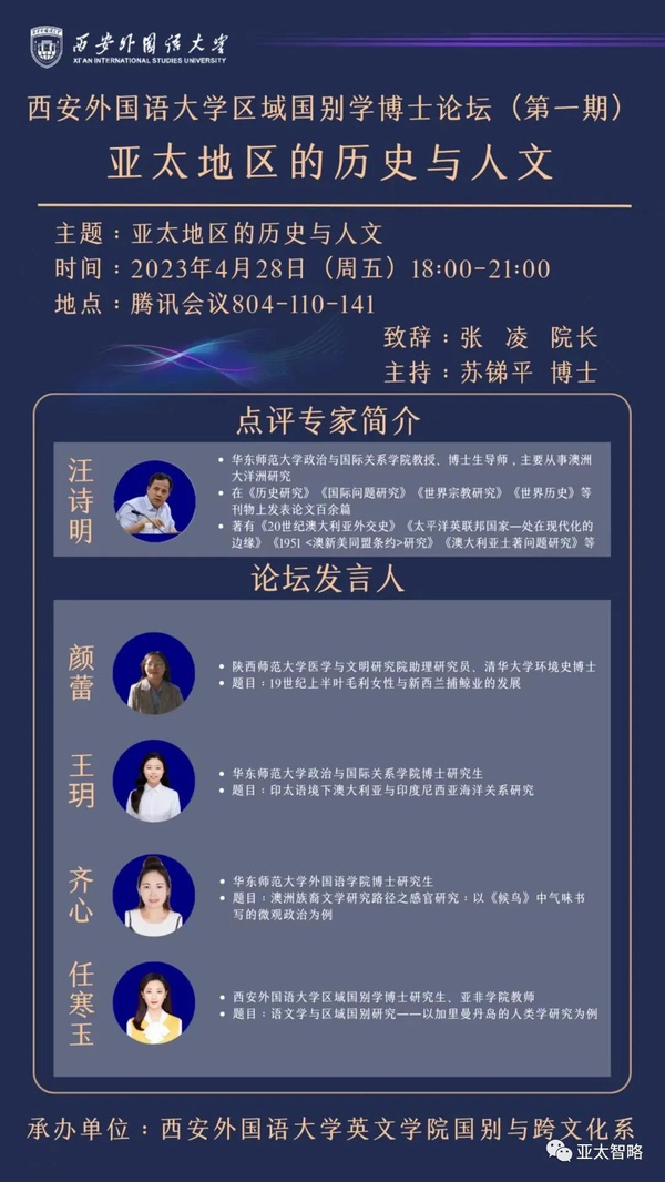 4月28日晚,西安外国语大学英文学院国别与跨文化系、西安外国语大学澳大利亚研究中心联合举办“区域国别学博士论坛”(第一期)。