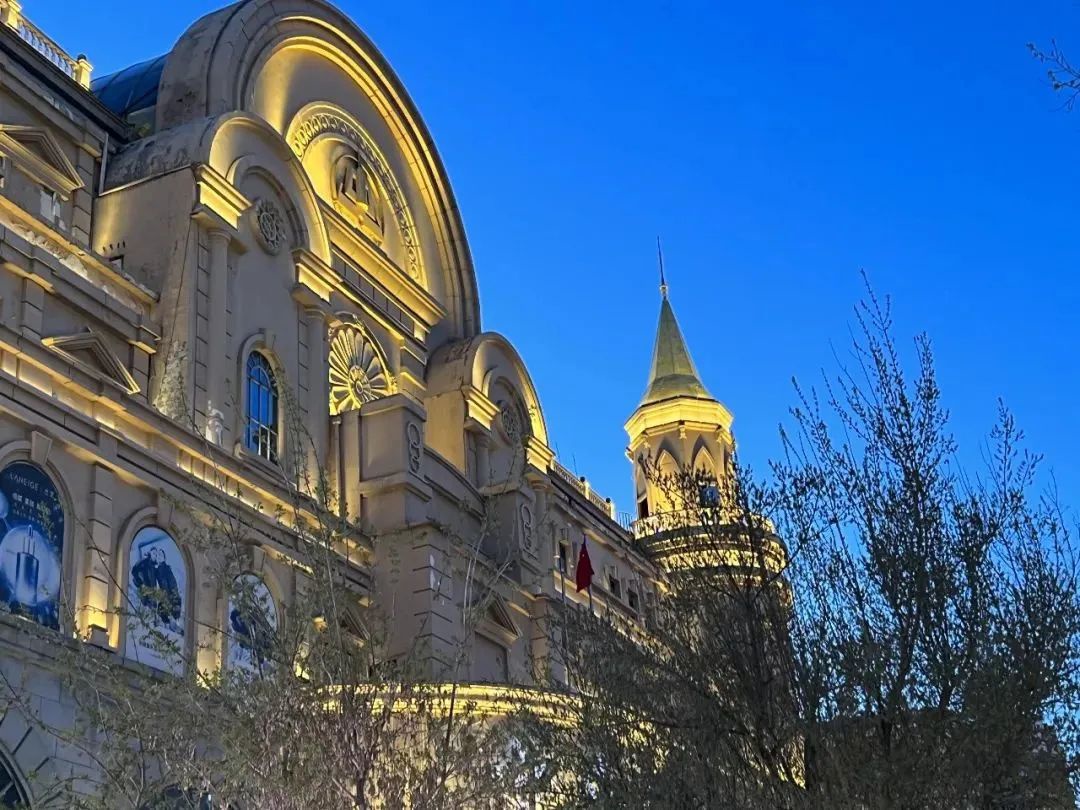夜幕下的灯光照在影院外墙上,再穿过玻璃罩透出来,让整个建筑看起来暖盈盈的,消散了晚风的冷冽。我们站在那里看了一会儿,对建筑正中央的金色雕塑起了兴致。苦于没有更详细的介绍,便无法感受那些雕塑的意义,只能匆匆拍下。