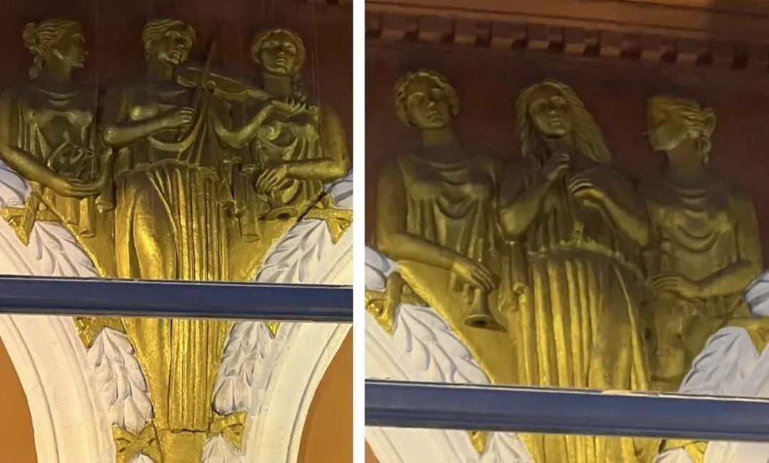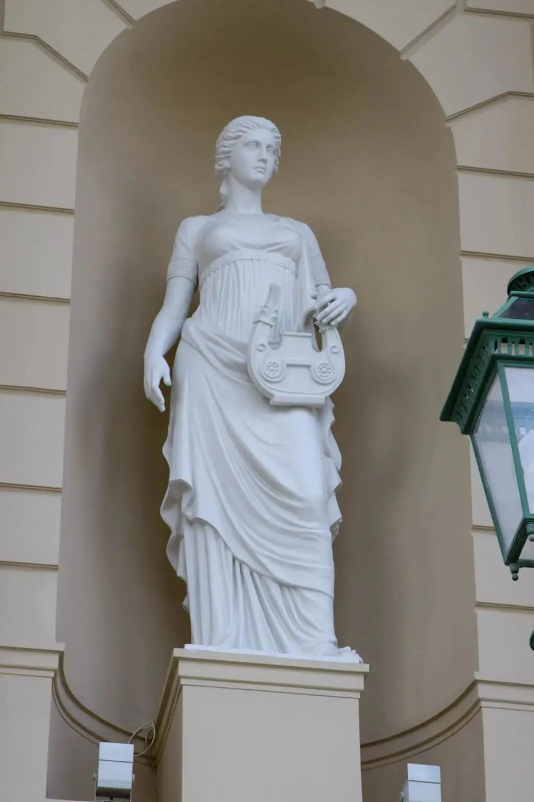 在回沪的行程中,一位同学查到这原来是希腊神话中缪斯的形象。在不同神话史诗中,缪斯女神数量由3到9位不等,但都负责掌管科学与艺术,如悲剧、诗歌、记忆。在剧院建筑中,镶嵌缪斯女神是一种常见的做法。莫斯科大剧院正立面的壁龛中就有举着七弦琴的缪斯。