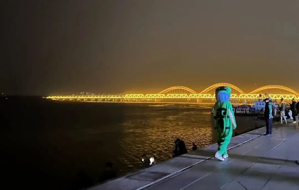 正要拿起手机拍一张,一位身着青蛙玩偶服的夜市摊主儿走过。这身装扮是近来全国各景区夜市揽客的招牌,一般和一堆青蛙气球一起出现,向游客戏称“卖孩子”。现在,他就这么形单影只的出现在我的镜头里,和夜幕下的江桥一起定格在江边的晚风中。
