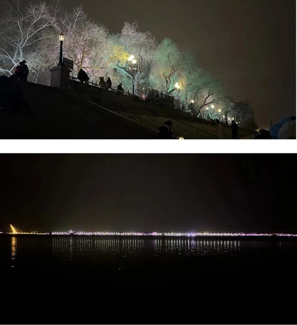 江风混着街头艺人的歌声飘来。循着声音往前走,我们来到送花江南岸的江堤上。比起中央大街上的游客,这里更多是本地的青年。他们三三两两的坐在临江提岸的阶梯上。听着歌,聊着天,看着江北新城的市政灯景。