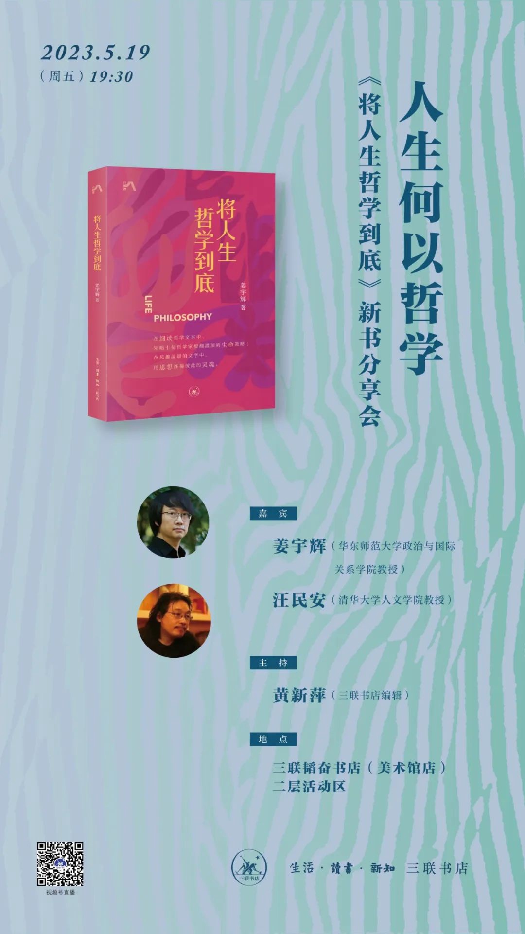 2023年5月19日19:30,我院姜宇辉教授将作「人生何以哲学——《将人生哲学到底》新书分享会」,并与清华大学人文学院教授汪民安对谈人生与哲学。