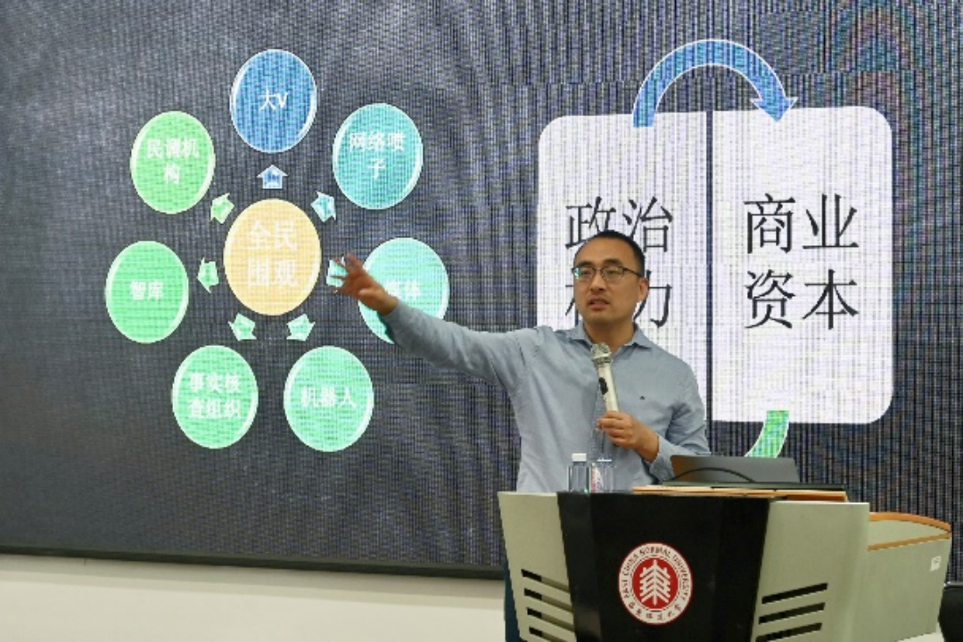 5月19日上午,华东师范大学人文社会科学2023年百场校级讲座在闵行校区一教110报告厅举行。我院特别邀请复旦大学新闻学院教授、博士生导师汤景泰作题为「AIGC与计算宣传:国际舆论战的挑战与应对」的讲座。本场讲座由华东师范大学政治与国际关系学院易妍副教授主持,来自政治与国际关系学院、传播学院等近百名师生参加了本次讲座。