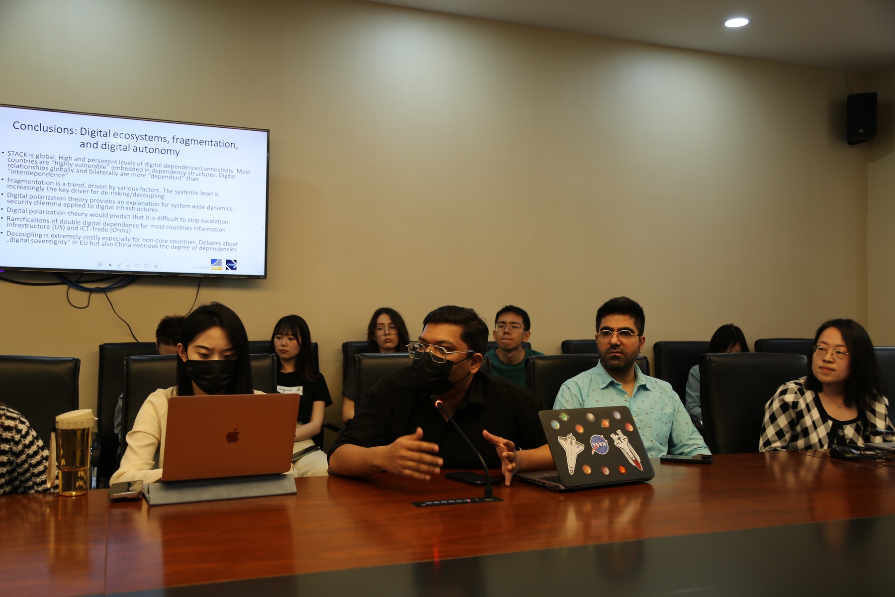 Mayer教授认为,全球数字生态系统是全球基础设施的重要组成部分;他引入迈克尔·曼(Michael Mann)的基础性权力(infrastructural power)概念加以阐述。接着,Mayer教授分别介绍了三种数字碎片化模型、数字极化理论及其演变逻辑。在讲座后半段,Mayer教授向大家展示了碎片化具体现象的相关数据,讨论了当前相关监管的缺失,最后对整场讲座的内容进行了总结。