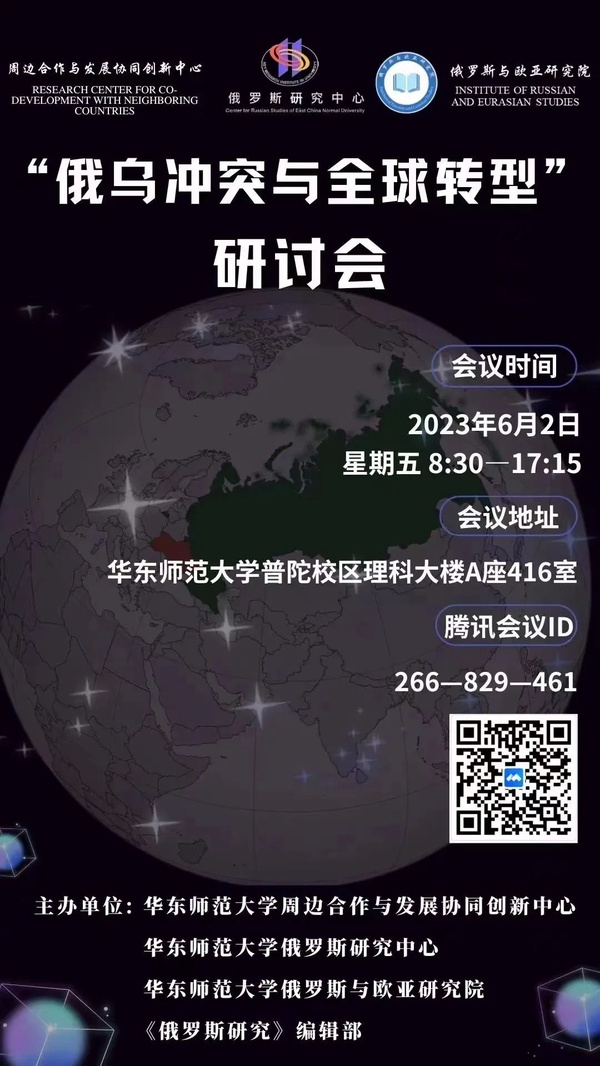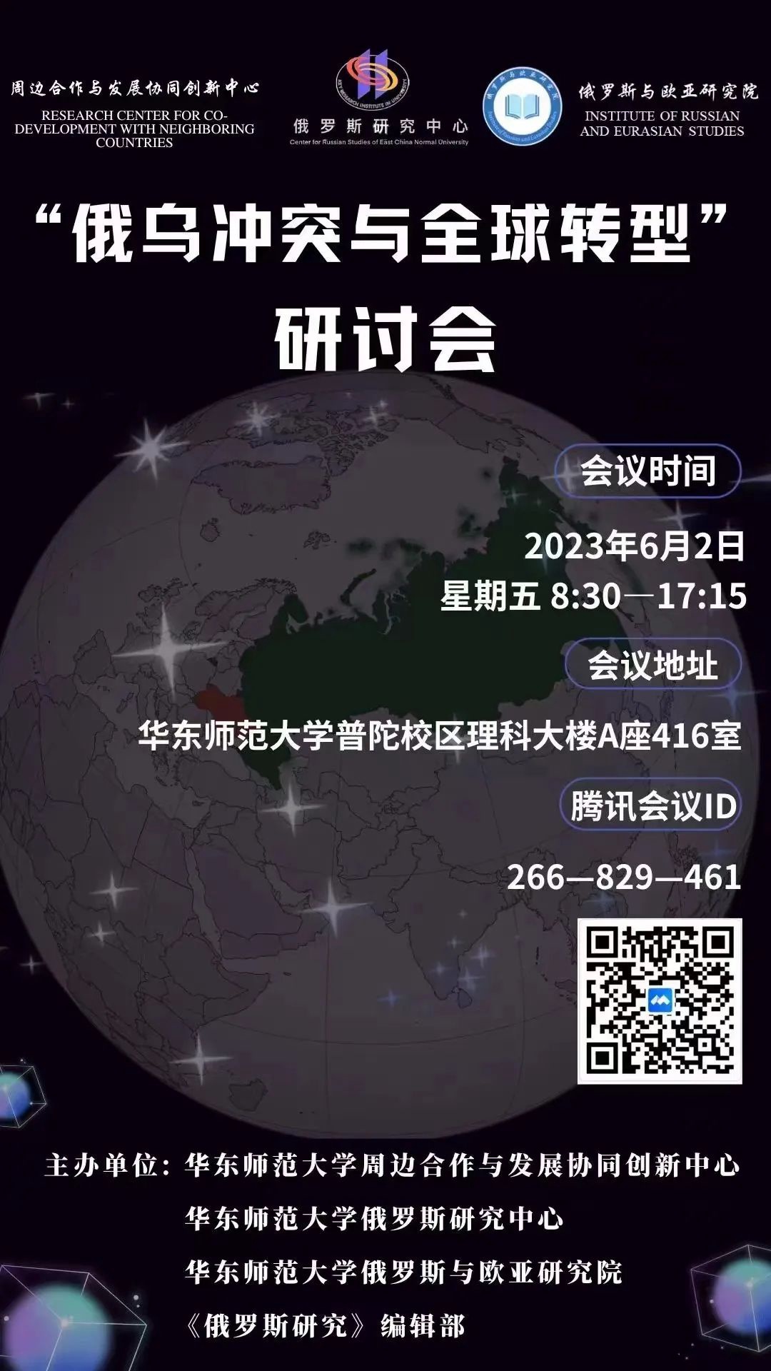 2023年6月2日(周五),华东师范大学政治与国际关系学院周边合作与发展协同创新中心、俄罗斯研究中心、俄罗斯与欧亚研究院及《俄罗斯研究》编辑部将共同主办「俄乌冲突与全球转型」研讨会。