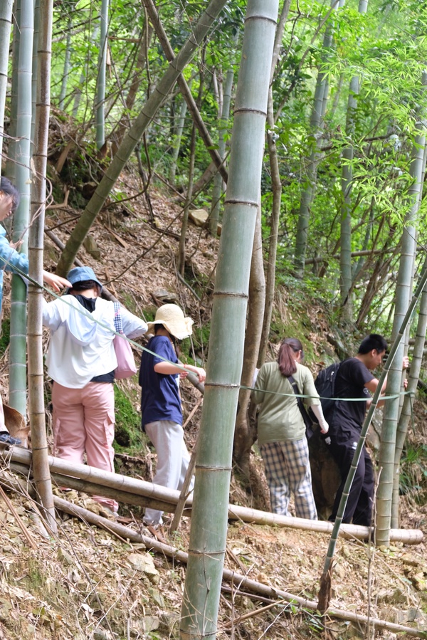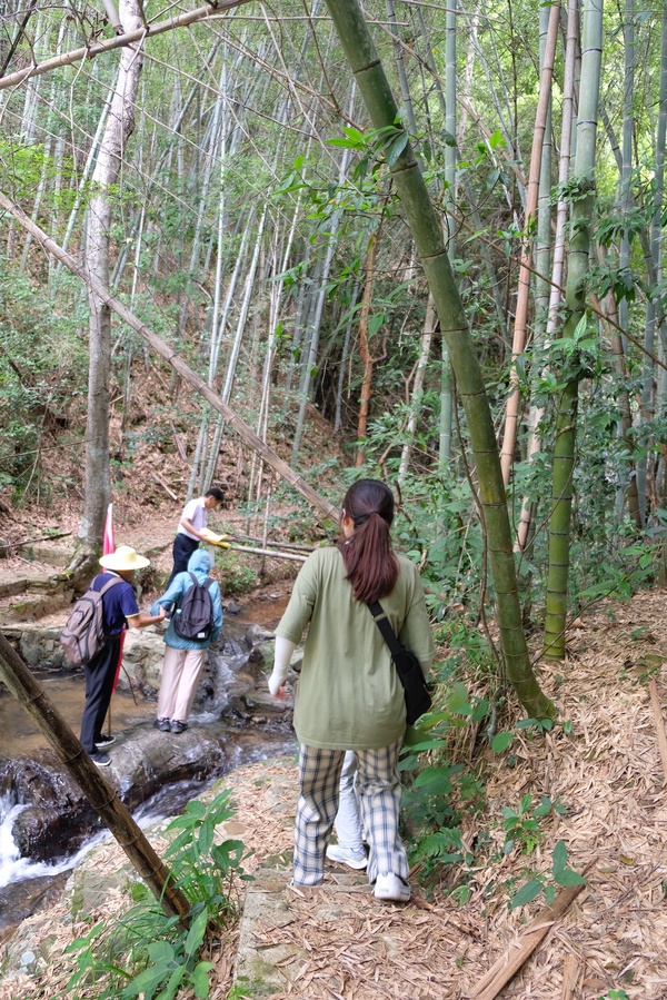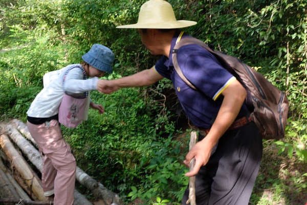 进山的路途中不光有惊喜,同时还伴随着大自然的挑战。由于山路较崎岖,中间还穿插着许多湍急的溪流、遍布苔藓的石块、古旧的木桥,在特定路段,同学们需要克服一定的心理恐惧才能顺利通过。