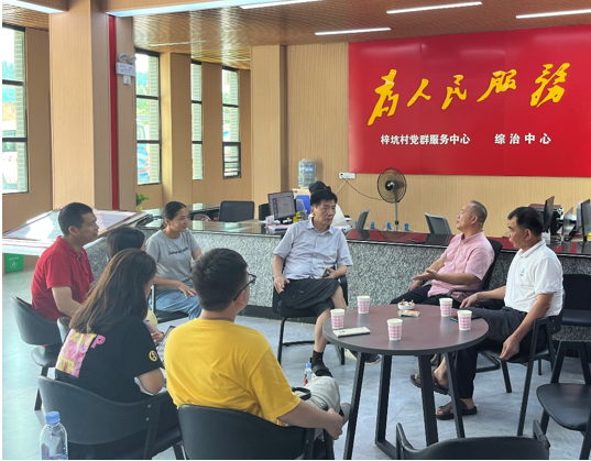 梓坑村党支部李雄发副书记热情接待,在乡村振兴方面很有思路,是来自基层一线的真知灼见。他首先介绍了基层党组织在乡村振兴工作中的成功经验,这就是以包容的态度、永不言弃的精神,用晓之以情、动之以理的方法,走进百姓心理,争取大家同频共情。随后李副书记畅谈了和君教育小镇落户梓坑村带来的“山乡巨变”和灿烂前景。梓坑村依托于和君教育小镇发展出了研学培训、劳务派遣、洗涤服务等特色产业。在谈到村庄发展前景时,李副书记表示,外地民众对赣南客家文化了解不足,曝光度也有所缺乏,如何推广村庄中的客家文化、珍珠粉工艺、采茶戏等文化要素,成为了现阶段的工作难点。