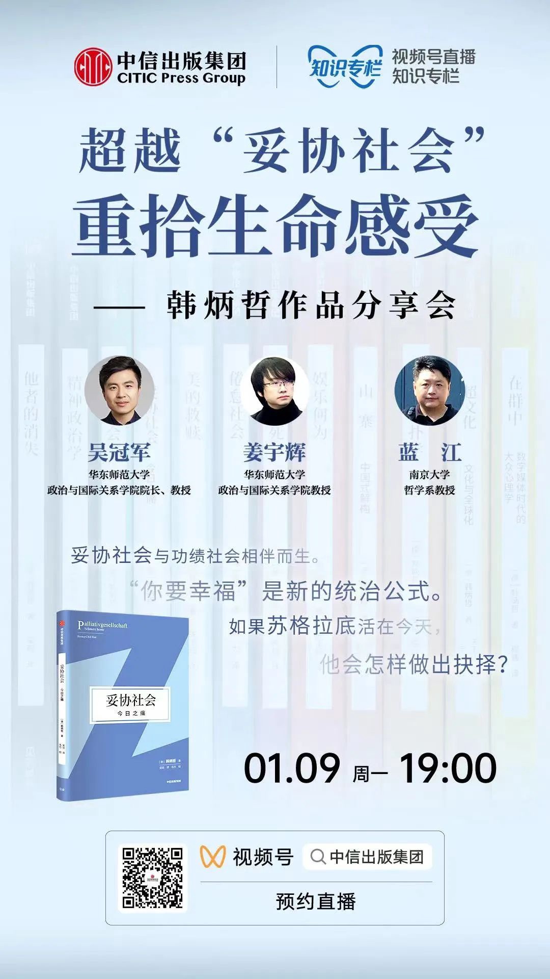 2023年1月9日,中信出版集团特邀华东师范大学政治与国际关系学院院长、教授吴冠军、华东师范大学政治与国际关系学院教授姜宇辉、南京大学哲学系教授蓝江,围绕韩炳哲及其《妥协社会》一书来聊聊在后疫情时代,我们该如何面对肉体和精神上的疼痛,以及在元宇宙的虚拟世界里,我们会如何理解快乐与痛苦,或者幸福与创伤。