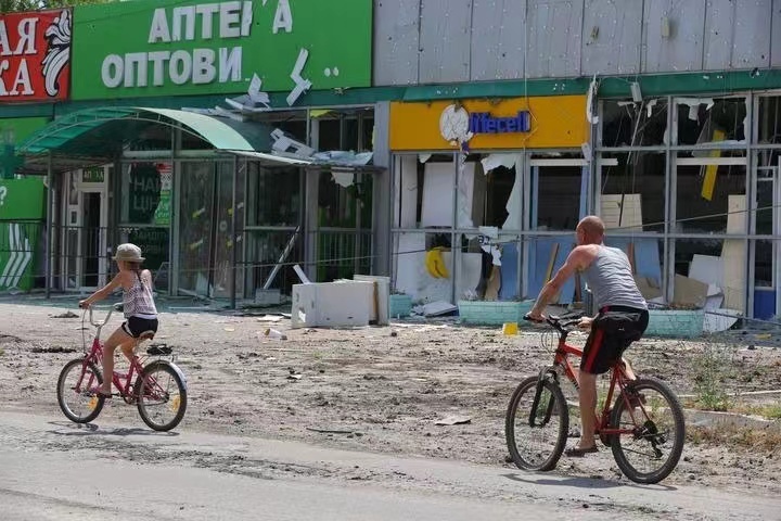 2022年7月4日在卢甘斯克地区的利西昌斯克,当地居民骑车经过一处被损坏的商铺(新华社)