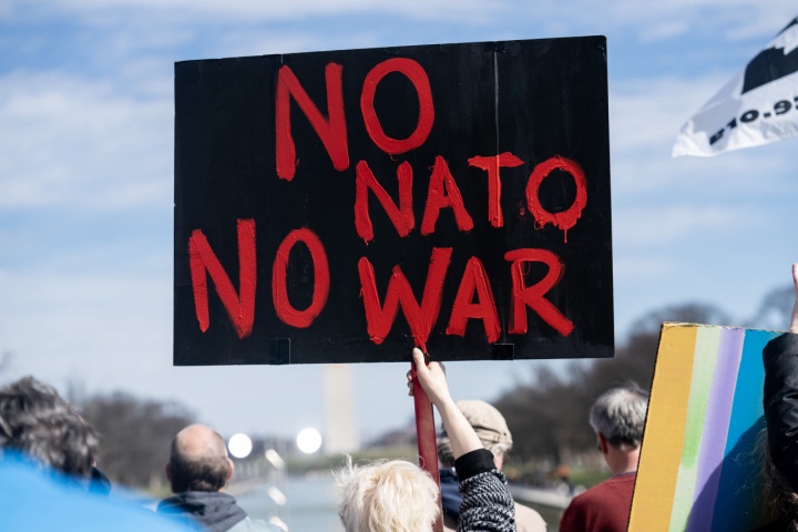 2月19日在美国首都华盛顿,抗议者要求美国停止煽动俄乌冲突、促进双方和谈(新华社)