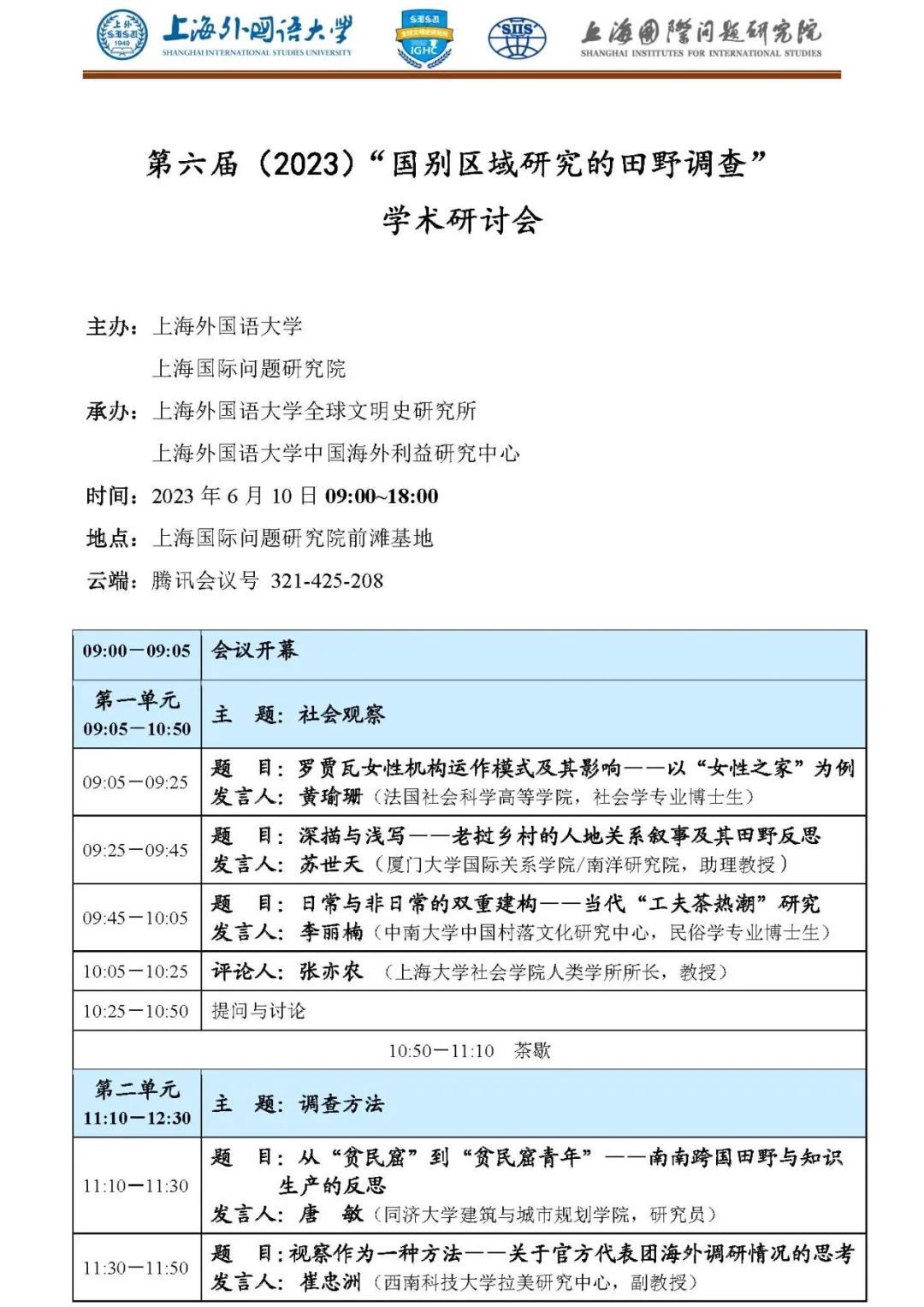 2023年6月10日(周六),我院副院长何明副研究员将出席由上海外国语大学与上海国际问题研究院共同主办,由上海外国语大学全球文明史研究所与上海外国语大学中国海外利益研究中心共同承办的第六届「国别区域研究的田野调查」学术研讨会」,并于第四单元「南亚田野」发表评论。