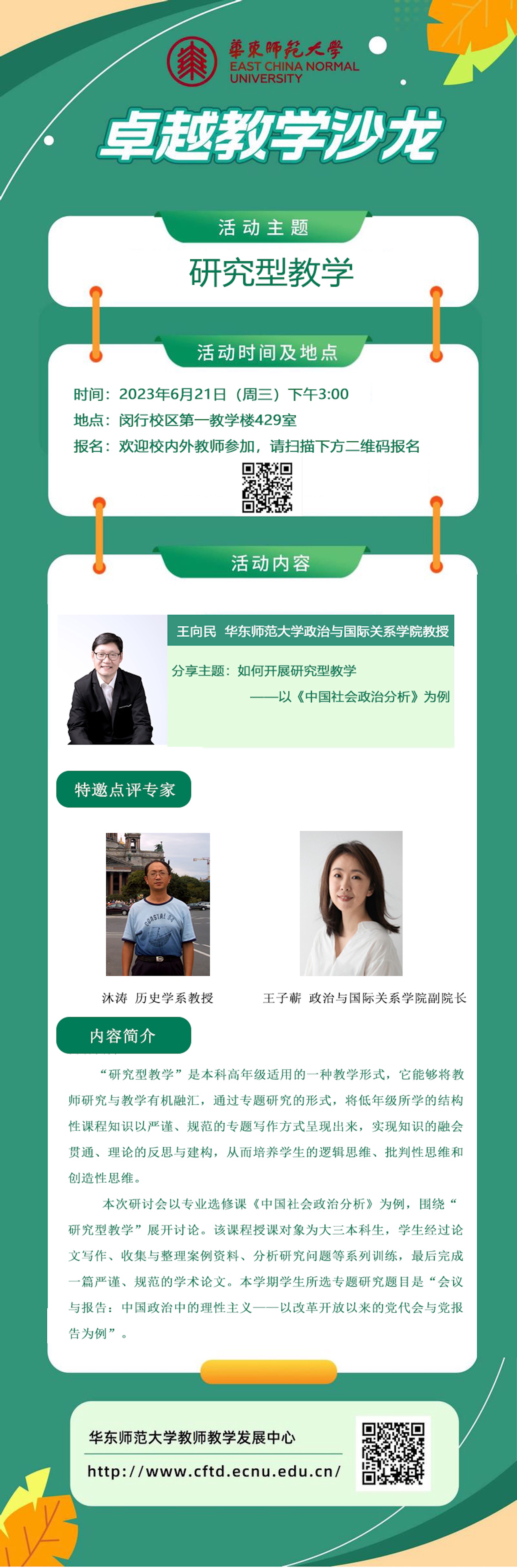 2023年6月21日(周三)15:00,华东师范大学政治与国际关系学院王向民教授将出席由华东师范大学教师教学发展中心主办的「卓越教学沙龙」活动,并就「研究型教学」这一主题做「如何开展研究型教学——以《中国社会政治分析》为例」的主题分享。