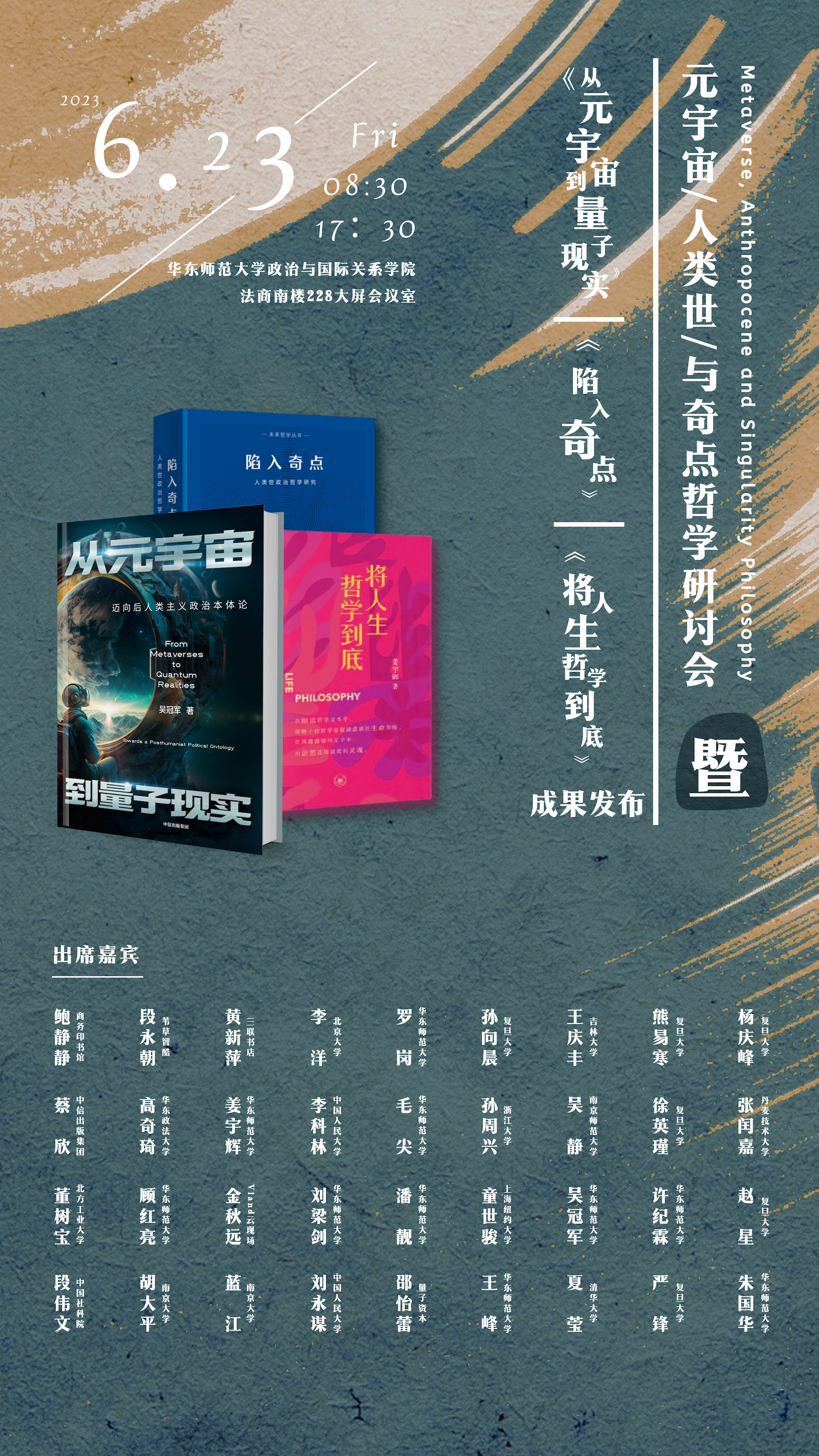 2023年6月23日,由华东师范大学奇点政治研究院、华东师范大学马克思主义学院、国家社会科学基金重大项目「后现代主义哲学发展路径与新进展研究」课题组共同主办,由中信出版集团、商务印书馆上海分馆及生活·读书·新知三联书店共同协办的「元宇宙、人类世与奇点哲学」研讨会——暨《从元宇宙到量子现实》《陷入奇点》《将人生哲学到底》成果发布即将开幕。