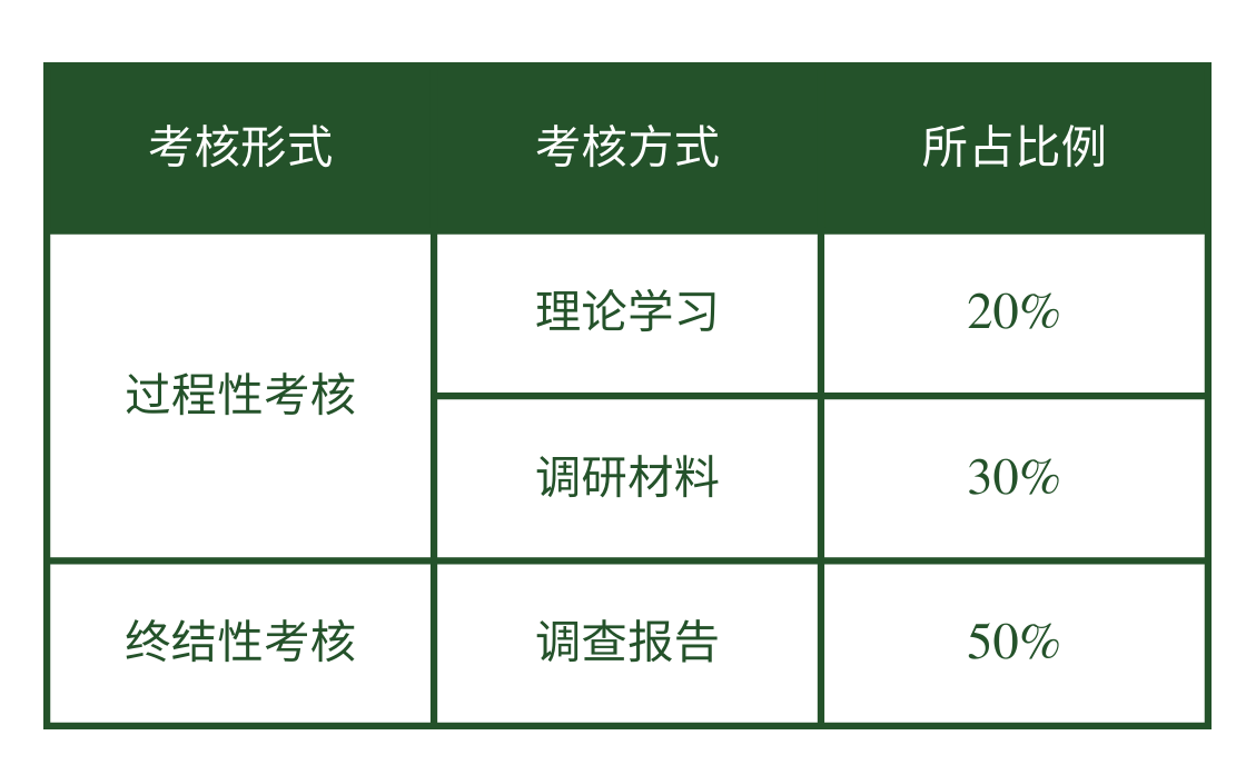 本课程采用三级评分制,坚持过程性考核和终结性考核并重,从理论学习(20%)、调研材料(30%)、调查报告(50%)三方面进行考核。